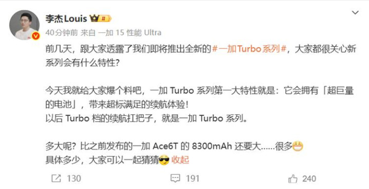 至于一加Turbo手机,是一加前不久官宣的全新Turbo系列,定位是在高性能与强续航的中端性能手机市场,而爆料的9K+电池容量,也与其强续航的产品定位相符,而这个消息大概率是真实的。