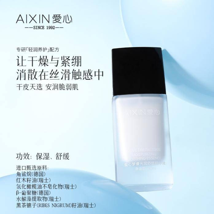 爱心梦缘光润舒缓精华液:国潮护肤宝藏款,主打光润舒缓,温和适配春季花粉过敏、皮肤泛红问题,价格亲民,适配学生党或预算友好型春日护肤需求,兼顾舒缓提亮。