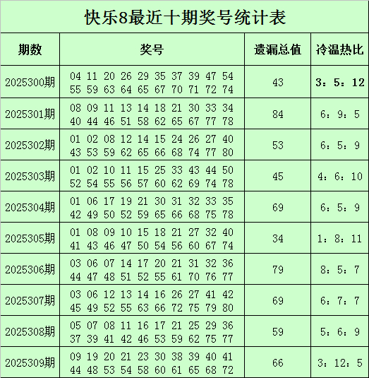 福彩快乐8第2025309期开奖回顾:09 19 20 21 23 30 38 39 40 41 44 48 53 54 58 60 61 65 68 72,其中冷温热码比为3:8:9,遗漏总值为66。